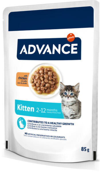 A zooplus. hu kínálatából: Az Advance Kitten csirke speciálisan egy évesnél fiatalabb kiscicák számára kifejlesztett macskaeledel. Kiegyensúlyozott tápanyagkeveréket tartalmaz, megfelelve a növekedésben lévő cicák igényeinek, s optimális fejlődésüket szolgálva. Kiváló minőségű összetevőiből azok tápértékének és ízének megőrzése érdekében kíméletes gőzben párolással készül az Advance Kitten csirke nedvestáp. Puha állaguknak köszönhetően a szószban mártózó csirkés falatkák könnyen rághatók és jól emészthetők. Az Advance Kitten csirke teljes értékű eledelként vagy szárazeledellel vegyesen is adható a kölyökmacskáknak. A táp E-vitamint is tartalmaz az immunrendszer támogatására, taurint a macska normál látása érdekében, valamint ásványi anyagokat a kiegyensúlyozott étrend szolgálatában. Kiscicája imádni fogja az Advance Kitten csirke finom ízét, és emellett ezt az eledelt fogyasztva hozzájut mindahhoz, ami szükséges ahhoz, hogy nagy és erős felnőtt macskává tudjon válni. Az Advance Kitten csirke jellemzői: Kiegyensúlyozott nedveseledel növekedésben lévő kiscicáknak 1 éves korigA növekedési fázisban lévő cicák igényeihez igazított összetételTámogatja az optimális fejlődést: fehérjéket biztosít az izomépítéshezKiváló minőségű összetevők: kíméletes gőzben párolással feldolgozva a természetes aromák lehető legjobb megőrzése érdekébenÉtvágygerjesztő: finom falatok csirkével ízletes szószban, puha állagú, a cicák könnyen meg tudják rágniHasználható teljes értékű eledelként vagy vegyes táplálásra, szárazeledel kiegészítéséreE-vitaminnal: az immunrendszer támogatásáraTaurinforrás: elengedhetetlen a normál látáshozKiegyensúlyozott és teljes értékű: értékes ásványi anyagokat szállít