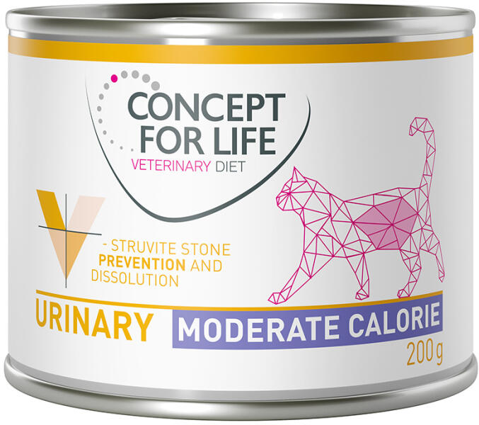 A zooplus. hu kínálatából: A macskák gyakran szenvednek húgyúti betegségekben, mint pl. hógyaghurut, húgyúti kövek, húgyúti elzáródás. Ezeket a FLUTD (Feline Lower Urinary Tract Disease) kifejezéssel foglaljuk össze. Gyakran előfordul, hogy ezek a betegségek kombinációban fordulnak elő. A macskák többnyire túl kevés folyadékot isznak, ezért magas koncentrációjú vizeletet választanak ki, melynek következményeként a felesleges ásványi anyagok kristályokként vagy homokként halmozódnak fel. A nagyobb ásványi anyag képződményeket köveknek nevezzük. A leggyakoribb húgyúti köveknek a struvit-kövek számítanak. Ezek a speciális struvit-kövek magnézium-ammonium-foszfát-vegyületb l állnak, és elsősorban alkáli PH-értékkel rendelkező vizelet esetén képződnek. Hogyan segíti macskáját a Concept for Life Veterinary Diet Urinary?A Concept for Life Veterinary Diet Urinary Moderate Calorie egy teljes értékkel bíró speciális fejlesztésű prémium diátés eledel felnőtt macskák számára, s optimális a húgyúti kövekkel küzdő és az alsó húgyúti betegségekben szenvedő állatok táplálkozási igényeinek kielégítésére. Vizeletsavasító tulajdonságának köszönhetően elősegíti a már kialakult struvit kövek feloldását. Mivel a struvit-kövek nagyrészt magnéziumból és foszforból állnak, a Concept for Life Veterinary Diet Urinary alacsony, de a szükséges mennyiséget lefedő magnéziumot és foszfort tartalmaz. A diétás nedvestáp kalóriatartalma mérsékelt, hogy megkönnyítse a súlyszabályozást. A nedvestáp magas nedvességtartalma segíti macskáját, hogy még több folyadékot vegyen magához, ami átmossa a húgyutakat, és hígítja az állat vizeletét. Mindez azt eredményezi, hogy az ásványi anyagok kevésbé rakódnak le, és a baktériumok jobban kiválasztódnak. A Concept for Life Veterinary Diet Urinary az alsó húgyúti traktus betegségeinek kezelésére is alkalmas mivel a glükózamin és a kondroitin-szulfát erősíti a hólyag nyálkahártyáját. A lazacolaj hozzájárul a fényes szőrzet és a bőr rugalmasságának megőrzéséhez. Concept for Life Veterinary Diet - az Ön macskájának különleges táplálkozási igényeire szabva. Ellenjavallatok:Nem alkalmas vemhes és szoptató macskák vagy kiscicák számára, májelégtelenség esetén, amely zavaros epekiválasztódással jár, valamint oxalát- vagy urát kövekkel küzdő macskák eseténMinőségi garanciánk:Teljes értékű diétás eledel az Ön macskájának különleges táplálkozási igényeire szabvaTudományos alapokon nyugvó táplálkozási koncepció, mely támogatja az állatorvos által előírt kezeléstGabonamentes receptúraBúza-, kukorica-, és szójamentesKiváló elfogadottság és jó emészthetőség a minőségi húsipari nyersanyagoknak köszönhetőenNémetországban gyártott Általános megjegyzések: Struvit-kövek feloldásáraStruvit-kövek újbóli kialakulásának csökkentéséreVizeletsavasító tulajdonságokkalHasználata vagy etetési időtartamának meghosszabbítása előtt ajánlott kikérni állatorvos tanácsát. Diétás eledel etetése során rendszeresen keressék fel az állatorvost a háziállat kontrollvizsgálata céljából!Amennyiben háziállata állapota rosszabbodbna, késedelem nélkül kérje ki állatorvosa véleményét!