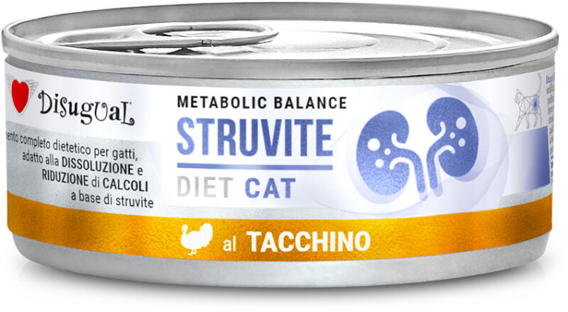 A zooplus. hu kínálatából: A Disugual Metabolic Balance Struvite Cat pulyka kiegyensúlyozott nedveseledel, melyet a struvitkövek feloldására és kialakulásuk csökkentésére fejlesztettek ki. A puha pástétom állagú nedvestáp csábítóan finom ízt kínál macskájának. A diétás macskaeledel vizeletsavas tulajdonságokkal bír, ilyen módon elősegítve a vizelet optimális pH-értékét, ami kedvezőtlen a struvitkövek kialakulásához. Emellett a csökkentett magnéziumtartalom korlátozza a vizeletben a struvit-alkotóelemek mennyiségét. A Disugual Metabolic Balance Struvite Cat pulyka esszenciális zsírsavak és emésztést elősegítő prebiotikumok forrásaként is szolgál. A Disugual Metabolic Balance Struvite Cat pulyka jellemzői:Teljes értékű diétás eledel macskáknak a struvitkövek feloldására és a struvitkövek kiújulásának csökkentéséreVizeletsavasító tulajdonságok: elősegíti a vizelet savas pH-értékét, ami kedvezőtlen a struvitkövek kialakulásáhozCsökkentett magnéziumtartalom: korlátozza a vizeletben a struvitkövek létrejöttéhez kedvező alkotóelemek mennyiségétPrebiotikumokkal: az értékes XOS és FOS hozzájárulhat a természetes emésztéshezOmega-3 lazacolajból: esszenciális zsírsavak, fontosak a normál bőr és a szép szőrzet meglétéhezSzőlővel: természetesen gazdag polifenolokbanKiegyensúlyozott receptúra: alkalmas mindennapi teljes értékű tápláléknakPuha pástétom: finom textúraGazdag nedvességben: hozzájárul a megfelelő folyadékfelvételhezMesterséges színezékek, aromák és tartósítószerek nélkülMinőség OlaszországbólÁltalános figyelmeztetések:Használata vagy etetési időtartamának meghosszabbítása előtt ajánlott kikérni állatorvos tanácsát. Diétás eledel etetése során rendszeresen keressék fel az állatorvost a háziállat kontrollvizsgálata céljából!Amennyiben háziállata állapota rosszabbodna, késedelem nélkül kérje ki állatorvosa véleményét!