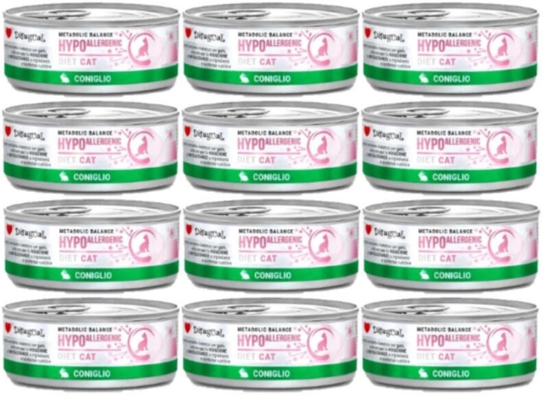 A Disugual HYPOALLERGÉN egy tápanyagban gazdag, kiegyensúlyozott és teljes értékű eledel vitaminokkal és ásványi anyagokkal, prebiotikus rostokkal (MOS és XOS) és Vitis vinifera-ból kivont antioxidáns polifenolokkal integrálva. Lenmagolajat és lazacolajat tartalmaz, amelyek természetes omega-3 és omega-6 zsírsavforrások. Minden recept egyetlen fehérjeforrást tartalmaz. Teljes értékű macskaeledel. Összetevők:Nyúl (hús) 47%, rizs, lenmagolaj, lazacolaj, XOS, ásványi anyagok, MOS, szőlő polifenolok, xilóz. Analitikai összetevők:Nedvességtartalom 82,1%, nyersfehérje 6,7%, nyersolajok és zsírok 5,8%, nyershamu 1,8%, nyersrost 0,5%, omega-3 zsírsavak 0,2%. Tápértéknövelő adalékanyagok (1 kg-onként):A-vitamin 7000 NE, D3-vitamin 500 NE, taurin 1000 mg, E-vitamin 60 mg, B1-vitamin 1 mg, B2-vitamin 2,4 mg, B5-vitamin 2 mg, B12-vitamin 0,004 mg, PP-vitamin 4 mg, kolin (kolin-klorid) 270 mg, vas (glicin-hidrát vas[II]-kelátja) 1,6 mg, réz (glicin-hidrát réz-kelátja) 1,15 mg, mangán (glicin-hidrát mangán-kelátja) 1,2 mg, cink (glicin-hidrát cink-kelátja) 10 mg, szelén (nátrium-szelenit) 0,08 mg. Adagolás:MACKA SÚLYA (KG)MENNYISÉG (G)1 - 270 - 1403 - 4210 - 2705 - 6340 - 410> 7> 460