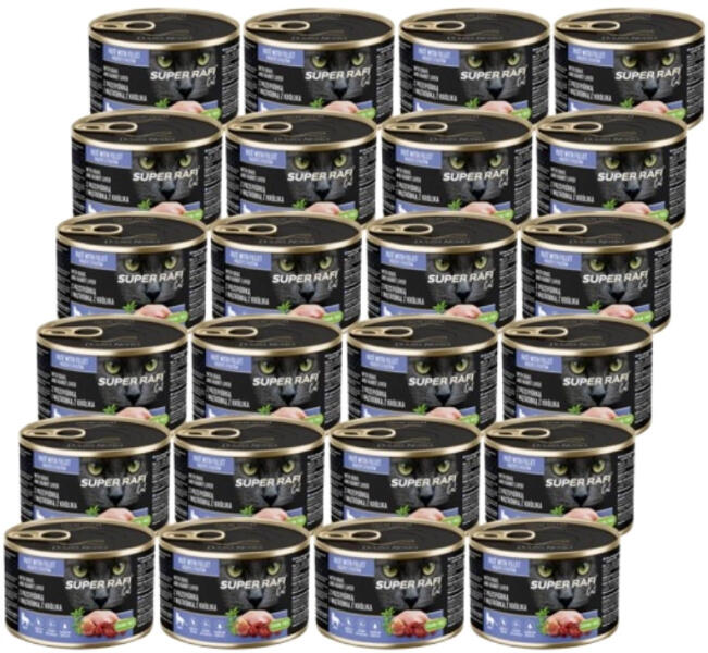 Összetevők: Hús és állati származékok 70% (csirkefilé 10%, fürj 4%, nyúlmáj 4%), olajok és zsírok (lenolaj 0,6%, lazacolaj 0,5%), ásványi anyagok, növényi származékok (céklalé por), szárított kakukkfű 0,01%. Analitikai összetevők: nyersfehérje – 11%, nyerszsír – 6%, nyershamu – 1,5%, nyersrost – 1%, nedvességtartalom – 79%, kalcium – 0,3%, foszfor – 0,25%. Adalékanyagok: Tápértékkel rendelkező adalékanyagok/kg: D3-vitamin – 134 NE, E-vitamin – 12 mg, C-vitamin – 34 mg, cink (cink-szulfát-monohidrát) – 15,5 mg, mangán (mangán-szulfát-monohidrát) – 1,3 mg, jód (kálium-jodid) – 0,3 mg, taurin – 800 mg. Ez a Super Rafi macskaeledel-változat könnyen emészthető fürjet és tápláló nyúlmájat ötvöz – olyan összetevőket, amelyek kiváló minőségű fehérjével gazdagítják macskája étrendjét. A 70%-ban húsból és állati melléktermékekből álló formula a felnőtt macskák egészségéhez elengedhetetlen aminosavak teljes készletét biztosítja.