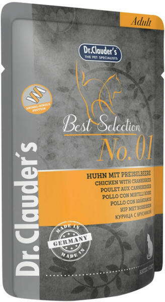 A Best Selection No 01 csirkével és tőzegáfonyával kizárólag természetes alapanyagokból készült szuperprémium minőségű eledel macskák számára 96,7% csirkével.