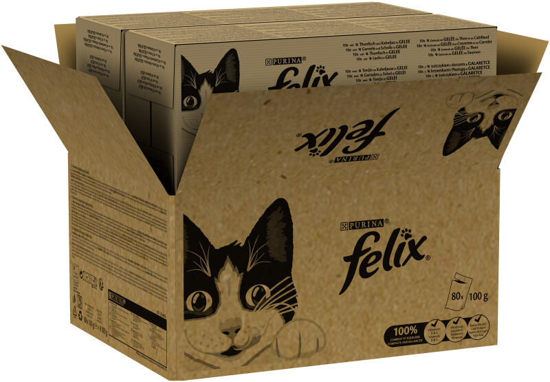 A zooplus. hu kínálatából: Ezzel a Felix csomaggal 80 tasak eledelt tárazhat be, így mindig kéznél lehet cicája számára finom eleség és közben a változatosságról is gondoskodhat. Mindegyik változat gondosan válogatott összetevőkből készül és extra szaftos állagú. Legyen szó akár aszpikos, akár szószos változatról, mindegyik elvarázsolja majd cicusa ízlelőbimbóit. Ezek a kiegyensúlyozott receptúrák ellátják bársonytalpú kedvencét minden létfontosságú táp- és vitálanyaggalAz omlós hús- és haldarabok mellett kiegyensúlyozott ásványianyag-tartalommal is rendelkeznek a tápok. A bennük lévő telítetlen omega-6 zsírsavak támogathatják cicája egészségét és a csillogó bunda kialakulását. Ráadásul a D- és E-vitamin hozzájárul a vitalitáshoz. A teljes értékű eledelek nemcsak étvágygerjesztőek és fenségesen illatoznak, hanem támogatják szobatigrise jó közérzetért. A praktikus 100 g adagok egyszerűen és gyorsan tálalhatók. Tökéletes étek mindennapra, mellyel kényeztetheti négylábú ínyencét! Tengeri válogatás:20 x tonhal tőkehal aszpikban20 x garnéla lepényhal aszpikban20 x tonhal aszpikban20 x lazac aszpikbanVidéki válogatás:20 x csirke aszpikban20 x marha aszpikban20 x csirke vese szószban20 x kacsa bárány szószbanHús- és halválogatás:20 x kacsa bárány szószban 20 x csirke vese szószban20 x 85 g tonhal tőkehal aszpikban20 x 85 g garnéla lepényhal aszpikbanA Felix Original tasakos 80 x 85 g jellemzői:80 darabos gazdaságos csomag nedves macskatápokból100%-ig kiegyensúlyozott receptúra: létfontosságú táp- és vitálanyagokkal, teljes értékű eledelként alkalmas Változatos ízek: hallal, illetve hússal szószban vagy aszpikbanÁsványi anyagokkal, D- és E-vitaminnal: fokozza kedvence vitalitását és jó közérzetét Omega-6 zsírsavakkal: a telítetlen zsírsavak elősegítik az egészséges bőrt és csillogó bundát Ellenállhatatlanul finom: kellemes illattal és ínycsiklandozó küllemmelMinőségi összetevőkből: válogatott alapanyagok használatával gyártói garanciával
