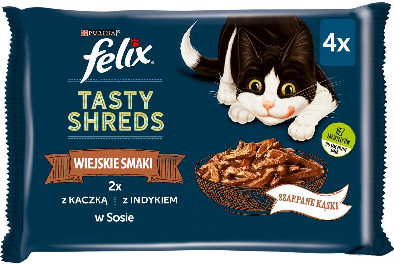 FELIX FELIX Tasty Shreds nedves macskaeledel kacsával és pulykával szószban 4x80g
