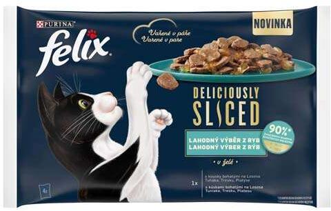 FELIX Deliciously Sliced macskaeledel: Finom, szeletelt hal zselében ? Ez a teljes értékű eledel felnőtt macskáknak, sterilizált/kasztrált macskának is tökéletes. A FELIX Deliciously Sliced finom, gondosan párolt, magas fehérjetartalmú hal szeleteket ízletes zselében kínál, amit a cicád imádni fog! A szeletek olyan finom megjelenésűek, illatúak és ízűek, mintha te magad készítetted volna el! ? Ízletes választék: Lazac Tonhal Tőkehal Lepényhal Miért válaszd a FELIX Deliciously Sliced-et?Magas fehérjetartalom: Erőteljes és egészséges macskáért ? Esszenciális omega-6 zsírsavak: A fényes szőrzetért és egészséges bőrűért ✨ Megfelelő vitamin kombináció: A kiegyensúlyozott táplálkozásértFinom zselé: Ínycsiklandozó élmény a cicádnak! ? Összetétel (példa lazacra): Hús és állati melléktermékek (22%), hal és halmelléktermékek (ebből 14% lazac darabokban), tojás és tojás melléktermékek, ásványi anyagok, élesztő, cukrok. Analitikai összetevők:Összetevő SzázalékNedvesség 83%Nitrogéntartalom 9,5%Zsírtartalom 3,4%Hamu 2,5%Rost 0,05%Omega-6 zsírsav 0,5%Etetési útmutató: Egy átlagos súlyú (4 kg) felnőtt macska számára javasolt napi adag: 2 tasak + 30g PURINA felnőtt macska száraz táp. Az adagokat egyénileg kell beállítani a macska testsúlya alapján. Szobahőmérsékleten kínáld a cicádnak, és mindig legyen friss víz a rendelkezésére! ?