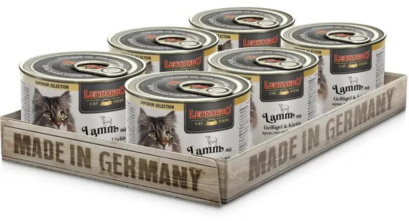 LEONARDO bárányhús baromfival és sütőtökkel Superior konzerv macskaeledelMivel a házimacska vadon élő fajtársaihoz hasonlóan húsevő, a LEONARDO konzerveledeleinek célja a színhús-minőség nyújtása. Természetes A-és D-vitamin tartalma pedig hozzájárul az egészséges, ragyogó megjelenéshez. Az egyévesnél idősebb, kifejlett macskák részére ezen kívül még több finom ízvilág áll rendelkezésre, amelyeket Ön kedve szerint kombinálhat egymással. Így cicája mindennap másféle LEONARDO ízt élvezhet. A LEONARDO megfelelően adagolva nyújtja mindazt, ami az Ön macskájának vitalitását növeli. Vitaminokkal, taurinnal és nyomelemekkel dúsítva. Mentes mindenfajta mesterséges színező-, ízesítő- és tartósító anyagtól. Etetése a Leonardo szárazeledelekkel történő kombinálással különösen ajánlott. Összetétel: baromfihús, -máj, -szív, -zúza (40%); húslé baromfiból és bárányból (28,8%); bárányhús, -szív, - máj, -tüdő, -vese (26%); sütőtök (4%); ásványi anyagok (0,5%); szárított tojáshéj (0,5%); lazacolaj (0,1%); szárított macskagyökér (0,1%)Összetétel elemzés: fehérje 11,0%; zsír 5,5%; nyershamu 2,0%; nyersrost 0,3%; nedvesség 79%Adalékanyagok / kg: Vitamin D3 200 N. E. ; Vitamin E 50 mg; taurin 1.000 mg; mangán (mint mangán-szulfát, monohydrát) 2 mg; cink (mint cink-szulfát, monohydrát) 20 mg; jód (mint vízmentes kalcium-jodát) 0,2 mg.