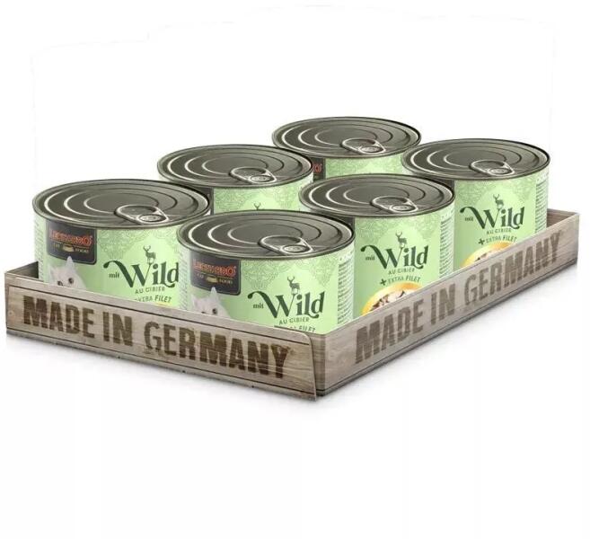 Leonardo vadhús + extra filé nedves macskatáp Teljes értékű nedves eledel felnőtt macskáknak ízletes vadhúsból extra csirkehús filével A Leonardo receptúrája attól olyan egyedi, hogy a húsokat saját levükben, kíméletesen főzik, ami ellenállhatatlan rágási élményt garantál.   A hozzáadott lazacolaj biztosítja a macska számára szükséges zsírsavakat és hozzájárul a selymes szőrzethez. Törekszünk arra, hogy eledeleink ne csak ízletesek, hanem egészségesek is legyenek ezért nem tartalmaznak hozzáadott cukrot, mesterséges színezőanyagot, ízfokozót és tartósítószert. Ezenfelül kizárólag emberi fogyasztásra is alkalmas,  extra friss húsból készítjük tápjainkat.