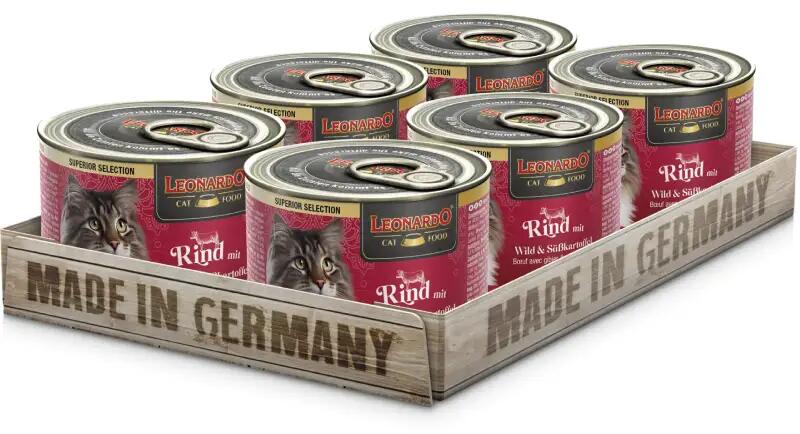 LEONARDO marhahús vaddal és édesburgonyával Superior konzerv macskaeledel. Mivel a házimacska vadon élő fajtársaihoz hasonlóan húsevő, a LEONARDO konzerveledeleinek célja a színhús-minőség nyújtása. Természetes A-és D-vitamin tartalma pedig hozzájárul az egészséges, ragyogó megjelenéshez. Az egyévesnél idősebb, kifejlett macskák részére ezen kívül még több finom ízvilág áll rendelkezésre, amelyeket Ön kedve szerint kombinálhat egymással. Így cicája mindennap másféle LEONARDO ízt élvezhet. A LEONARDO megfelelően adagolva nyújtja mindazt, ami az Ön macskájának vitalitását növeli. Vitaminokkal, taurinnal és nyomelemekkel dúsítva. Mentes mindenfajta mesterséges színező-, ízesítő- és tartósító anyagtól. Etetése a Leonardo szárazeledelekkel történő kombinálással különösen ajánlott. Összetétel: marhahús, -szív, -máj, -tüdő (40%); húslé marhából és vadból (28,8%); vadhús (szarvas, vaddisznó) (26%); édesburgonya (4%); ásványi anyagok (0,5%); szárított tojáshéj (0,5%); lazacolaj (0,1%); szárított macskagyökér (0,1%). Összetétel elemzés: fehérje 11,0%; zsír 6,5%; nyershamu 2,0%; nyersrost 0,3%; nedvesség 79%. Adalékanyagok / kg: Vitamin D3 200 N. E. ; Vitamin E 50 mg; taurin 1.000 mg; mangán (mint mangán-szulfát, monohydrát) 2 mg; cink (mint cink-szulfát, monohydrát) 20 mg; jód (mint vízmentes kalcium-jodát) 0,2 mg.