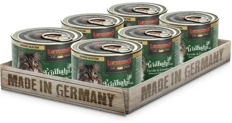 LEONARDO pulykahús pisztránggal és áfonyával Superior konzerv macskaeledel. Mivel a házimacska vadon élő fajtársaihoz hasonlóan húsevő, a LEONARDO konzerveledeleinek célja a színhús-minőség nyújtása. Természetes A-és D-vitamin tartalma pedig hozzájárul az egészséges, ragyogó megjelenéshez. Az egyévesnél idősebb, kifejlett macskák részére ezen kívül még több finom ízvilág áll rendelkezésre, amelyeket Ön kedve szerint kombinálhat egymással. Így cicája mindennap másféle LEONARDO ízt élvezhet. A LEONARDO megfelelően adagolva nyújtja mindazt, ami az Ön macskájának vitalitását növeli. Vitaminokkal, taurinnal és nyomelemekkel dúsítva. Mentes mindenfajta mesterséges színező-, ízesítő- és tartósító anyagtól. Etetése a Leonardo szárazeledelekkel történő kombinálással különösen ajánlott. Összetétel: pulykahús, -szív, -máj, -zúza (40%); húslé pulykából és pisztrángból (28,8%); pisztráng (26%); áfonya (4%); ásványi anyagok (0,5%); szárított tojáshéj (0,5%); lazacolaj (0,1%); szárított macskagyökér (0,1%). Összetétel elemzés: fehérje 11,0%; zsír 6,5%; nyershamu 2,0%; nyersrost 0,3%; nedvesség 79%. Adalékanyagok / kg: Vitamin D3 200 N. E. ; Vitamin E 50 mg; taurin 1.000 mg; mangán (mint mangán-szulfát, monohydrát) 2 mg; cink (mint cink-szulfát, monohydrát) 20 mg; jód (mint vízmentes kalcium-jodát) 0,2 mg.