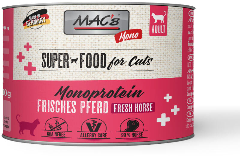 A zooplus. hu kínálatából: A MAC´s Mono Cat Sensitive nedves macskaeledel különleges receptúrája az eledelérzékeny macskák szükségleteihez igazított. Mivel sok állat nemcsak a gabonára reagál különféle allergiákkal és intoleranciával, hanem bizonyos állati eredetű fehérjeforrásokra is, a Mac's Mono Cat Sensitive eledelek esetében mindig csupán egyféle húsfajta felhasználására szorítkoznak. A különösen magas, 90% feletti húsrészarány a például szívből, májból vagy tüdőből származó, legfinomabb húsokból kiváló ízről és magas elfogadási arányról gondoskodik. A Mac's Mono Cat Sensitive előállítása során sem állati-, sem csontlisztet, de löncshúst sem használnak fel, gabona helyett pedig nagyon jól emészthető sárgarépa kerül az eledelbe, amely nem terheli meg külön az emésztőrendszert. A mesterséges aroma- és színező anyagokat valamint tartósítószereket teljesen mellőző, kíméletes előállítási módnak köszönhetően igazi természetes eledel jön létre. A hozzáadott taurin hozzájárul a jó szívműködéshez és a látás erejének fennmaradásához. További fontos vitaminok és értékes ásványi anyagok teszik kiegyensúlyozott tápanyagprofilúvá ezt az eledelt. A MAC´s Cat macskaeledelek Németországban készülnek. A MAC's Mono Cat Sensitive macskaeledel meggyőző tulajdonságai: Kiváló minőségű nedves macskaeledel bármely macskának Táplálékérzékeny állatok számára is ideális Németországban készül Single protein: egy eledel csak egyféle állati fehérjeforrást tartalmaz 90% feletti húsrészarány: a kiváló ízű, természetes táplálék érdekében Nem tartalmaz állat- és csontlisztet, löncshúst Gabona, szója, mesterséges aroma- és színező anyagok valamint tartósítószerek nélkül Taurinnal: a jó szívműködésért és a látóerő javítására Fontos vitaminokkal és ásványi anyagokkal: a kiegyensúlyozott, teljes értékű táplálék érdekében Kíméletes előállítási mód