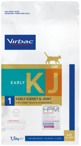 Fehérjében gazdag diétás táp macskáknak, ízületi anyagcsere-támogató osteoarthritis esetén, gazdag omega-3-ban és eikozapentaénsavban (EPA), megfelelő E-vitamin tartalommal, könnyen emészthető, gabonamentes, alacsony foszfortartalommal. A korlátozott mobilitás befolyásolhatja a macska vitalitását. A Virbac Veterinary HPM Cat KJ1 Early Kidney & Joint Support kifejezetten macskák számára lett kifejlesztve az ízületi anyagcsere támogatására osteoarthritis esetén.