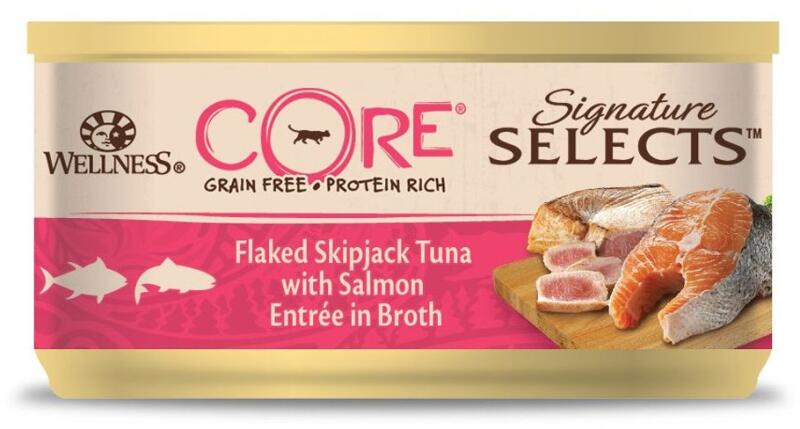 Wellness CORE gabonamentes teljes értékű konzerveledel tonhalból és lazacból ízletes szószban, felnőtt macskák számára.